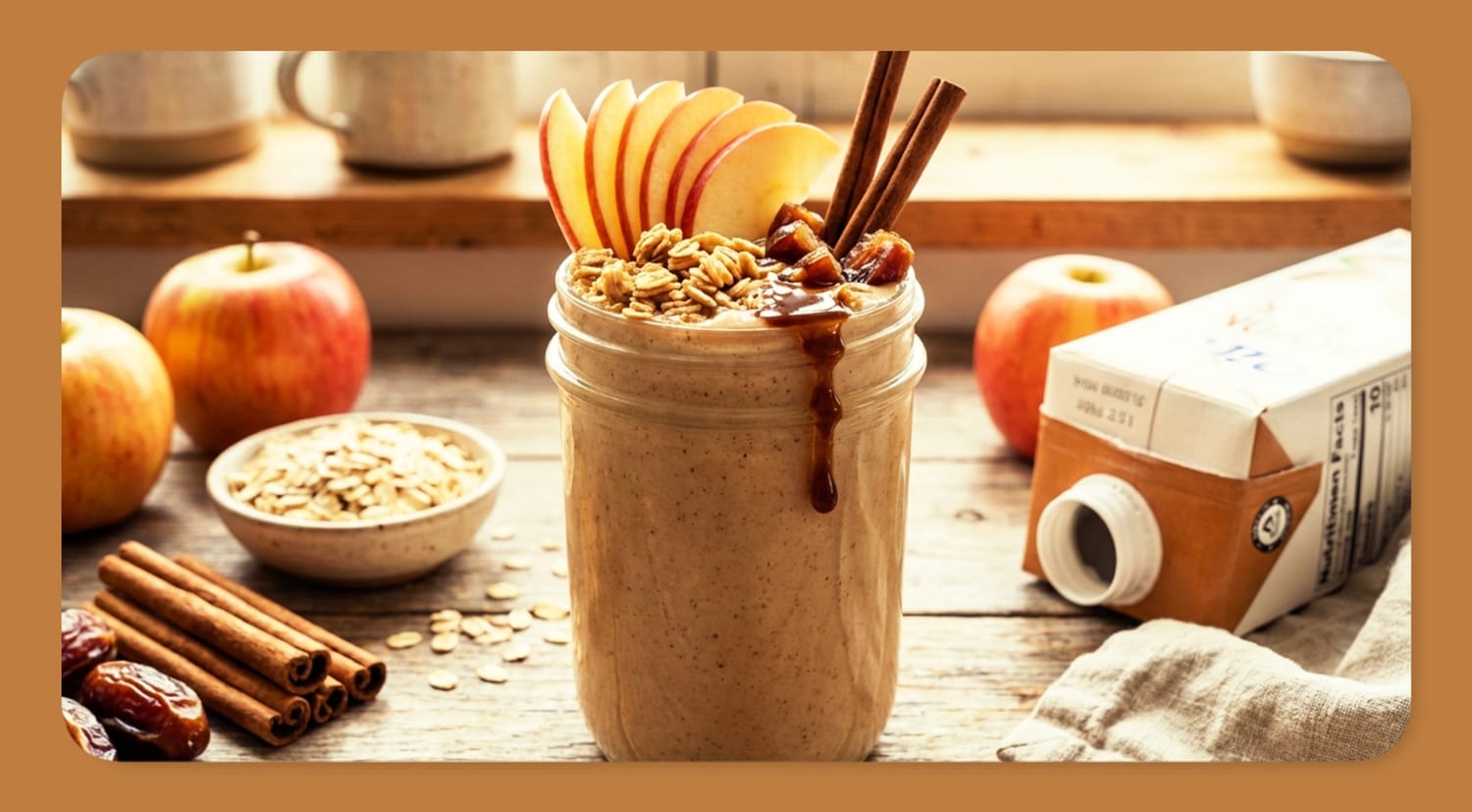 Warm cinnamon, sweet apple, and creamy oats blended into a dairy-free autumn treat that tastes like homemade pie in a glass.