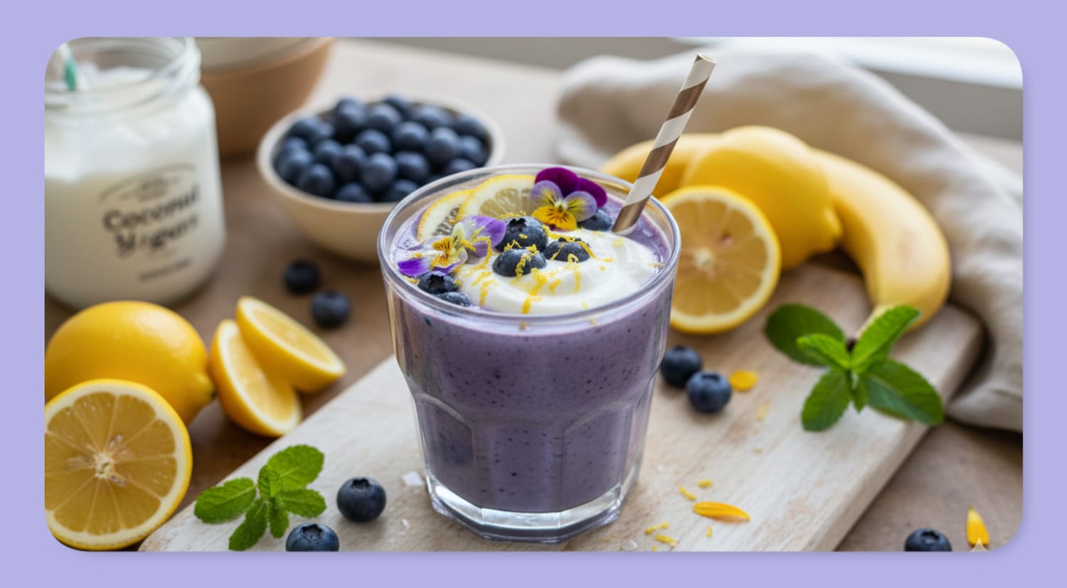 Tangy, sun-kissed lemon meets deep, sweet blueberries in a smoothie so refreshing it feels like the first warm day of spring captured in a glass. The color alone stops you in your tracks: a rich, jewel-toned purple-blue that deepens into indigo at the edges, with a brightness that practically hums with energy. One sip delivers a burst of tart citrus that rolls into sweet, juicy blueberry, finished with a cool, creamy smoothness from coconut yogurt that lingers just long enough to make you reach for the glass again.