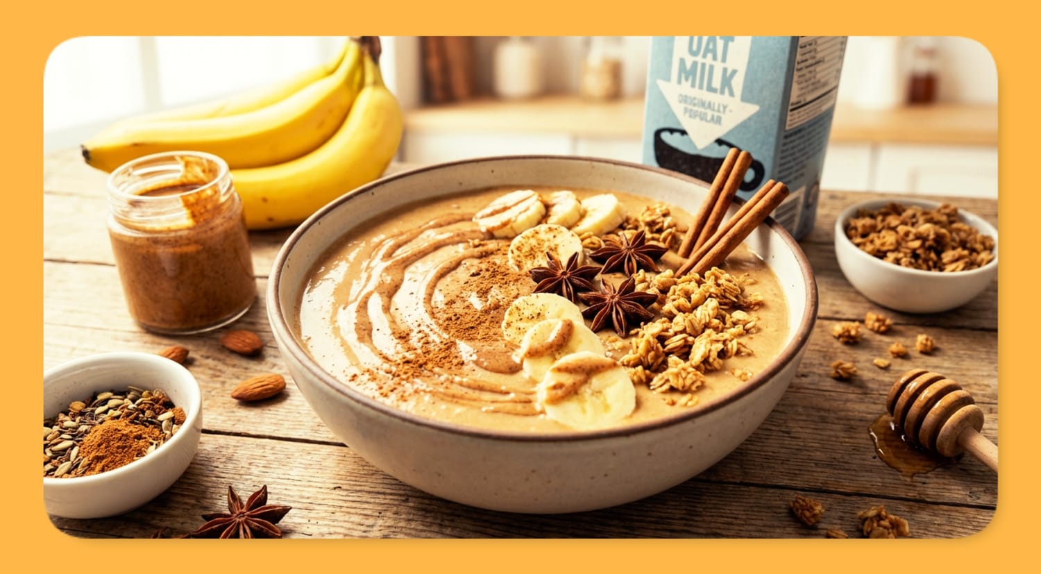 Steam rises gently from the mug of chai on the counter, filling the kitchen with cinnamon and cardamom. Now imagine capturing those exact cozy aromas in a thick, creamy smoothie bowl you can actually eat with a spoon. Warm spices swirl through frozen banana creaminess while almond butter adds richness and a drizzle of honey glistens on top. This is breakfast that feels like a hug.