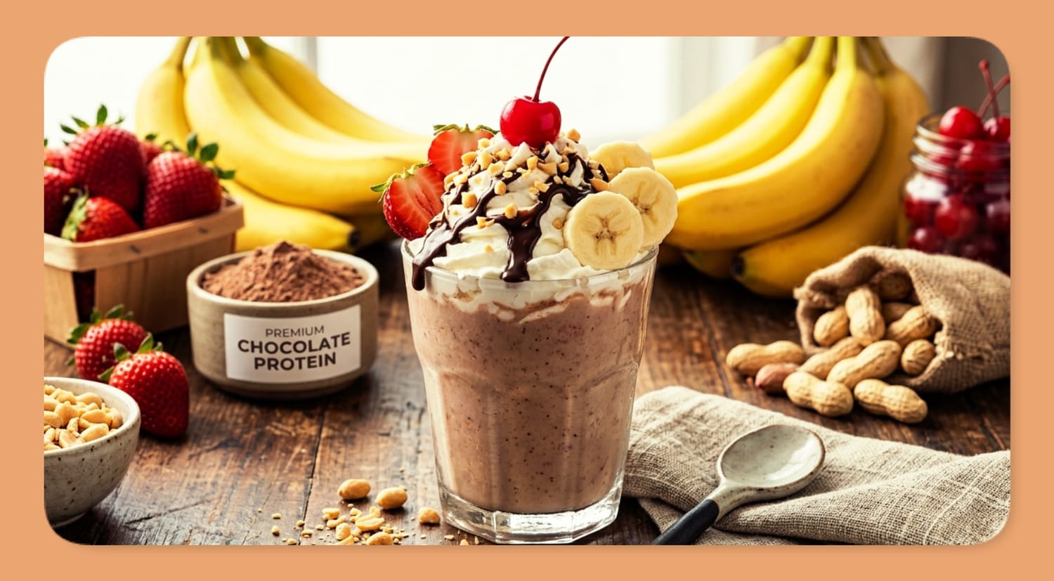 Chocolate protein powder replaces the chocolate ice cream scoop, delivering rich cocoa flavor along with muscle-building protein. Frozen banana and strawberries stand in for the fruit and ice cream base, creating natural sweetness and a thick, frosty texture. Crushed peanuts bring the same salty crunch you'd find on a traditional banana split, and a bright red cherry on top ties the whole experience together with that iconic finishing touch.