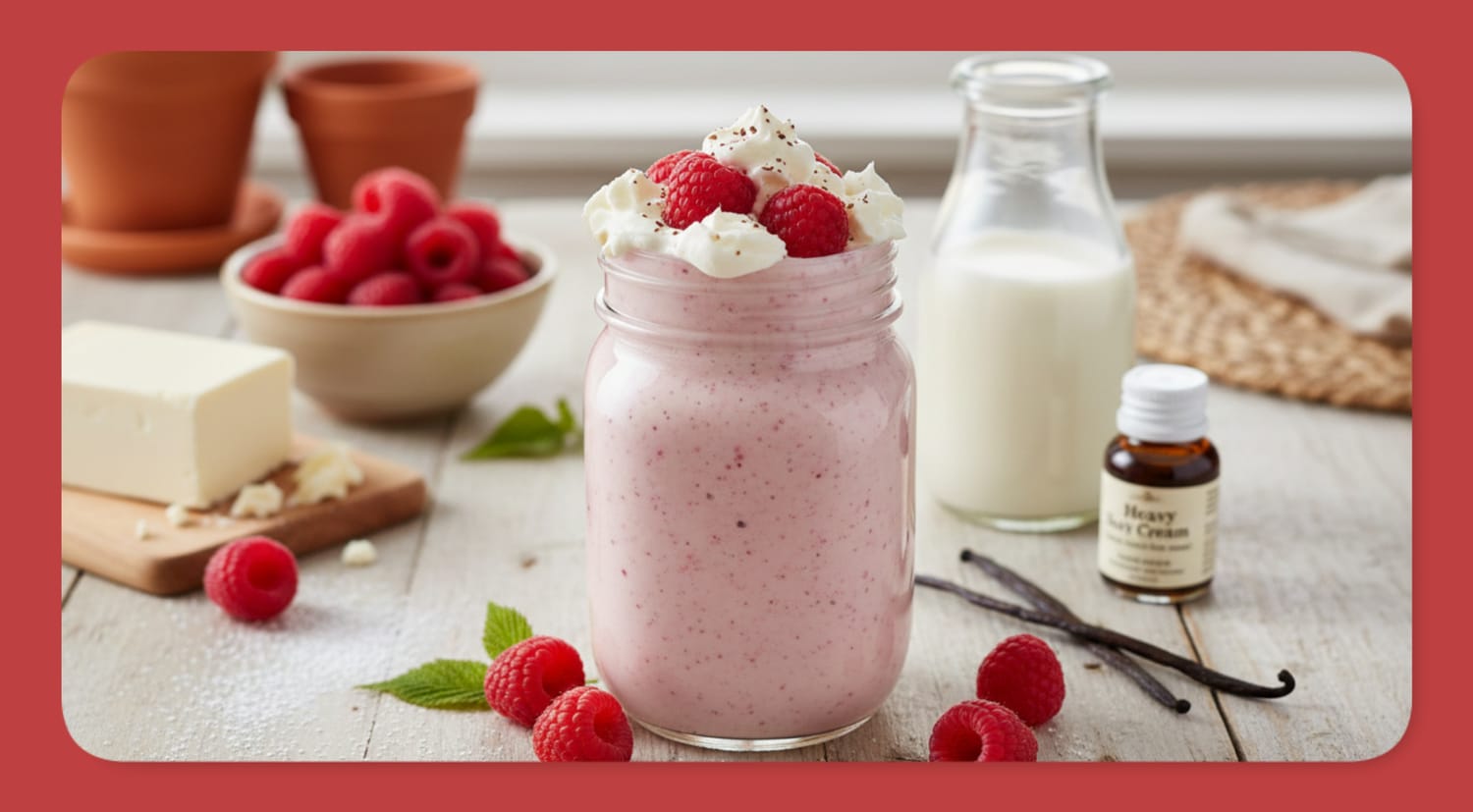 Pour into a clear glass to show off that gorgeous rosy pink color. For an Instagram-worthy layered effect, pour the smoothie into the glass first, then spoon a thin layer of extra whipped heavy cream on top and gently press 2 to 3 fresh raspberries into the cream. The pink-and-white contrast is absolutely stunning.