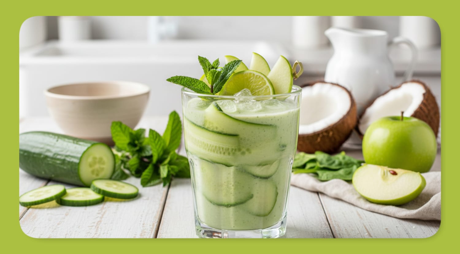 This delivers the same hydrating benefits as cucumber water but with added nutrition from spinach, apple, and lime. The blended format provides fiber that plain cucumber water lacks, plus more substantial electrolytes from coconut water.