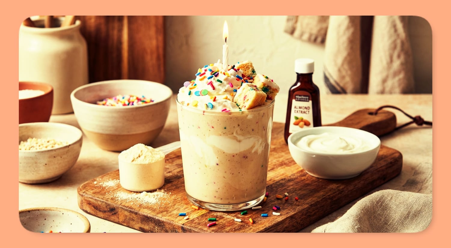 A thick, creamy smoothie that tastes exactly like birthday cake batter but delivers 35 grams of muscle-building protein, making every morning feel like a celebration worth waking up for.