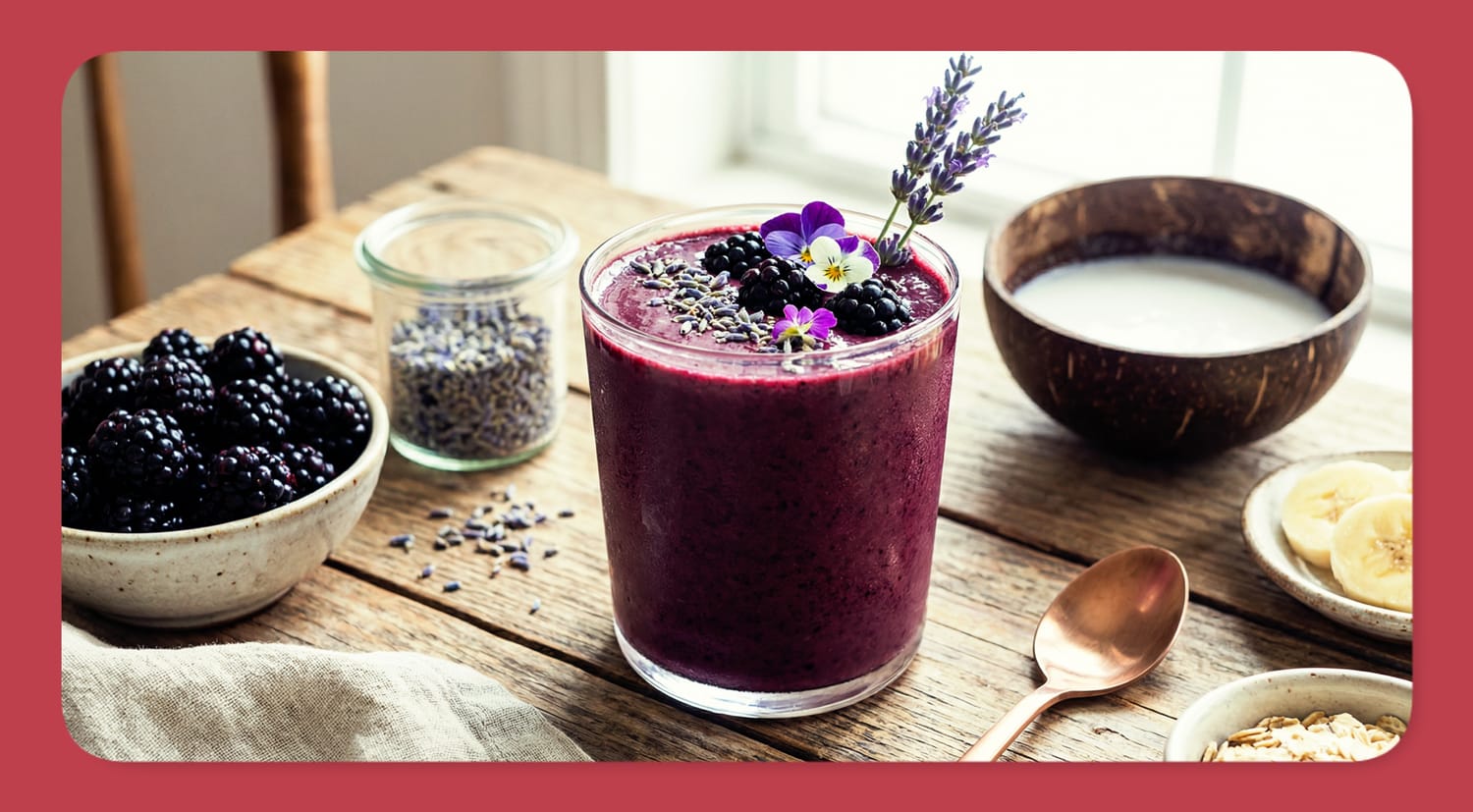 A stunning, jewel-toned plant-based smoothie with delicate floral notes and bold berry flavor, perfect for calm afternoons and self-care moments.