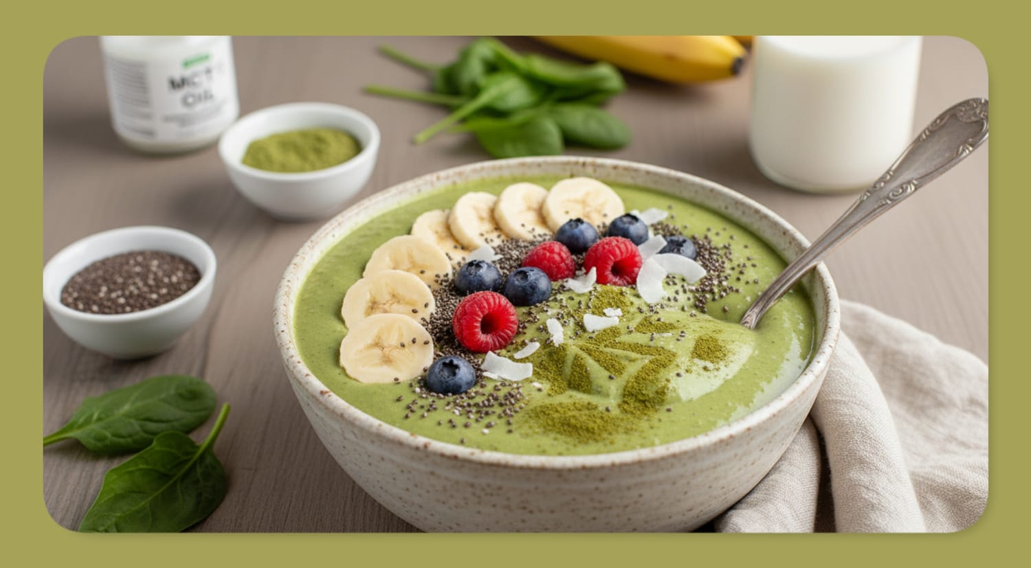 This recipe changes that entirely. By using frozen banana and coconut milk as the creamy base, the matcha flavor shines through clearly while maintaining that signature velvety smoothie bowl texture. A handful of spinach adds nutrition without any grassy taste, and the natural sweetness of ripe banana means no added sugars are needed. Best of all, the combination of L-theanine from matcha and natural energy from whole foods creates hours of focused, calm alertness. No coffee crash, no afternoon slump, just steady energy that carries you through your morning.